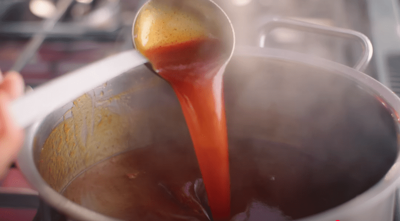 - Pour the blended paste through a fine sieve into a heavy-bottomed cooking pot.
